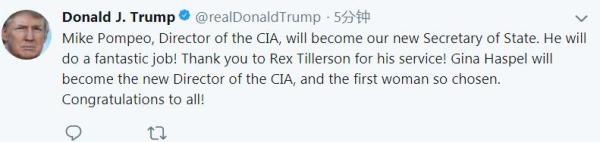 “中情局(CIA)局长麦克·蓬佩奥(Mike Pompeo)将成为新的国务卿。他将会做的很出色!感谢雷克斯·蒂勒森(Rex Tillerson)的工作。哈斯柏(Gina Haspel)将成为新的中情局局长,也是第一位选中(出任中情局长)的女性。恭喜所有人!”特朗普在个人推特上表示。