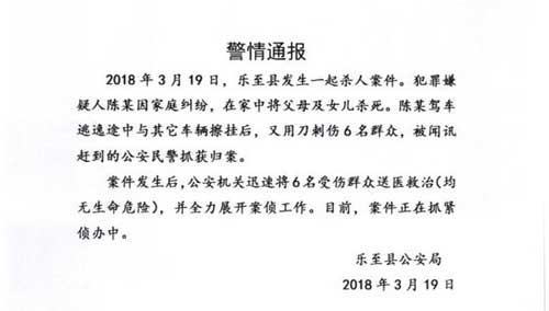 今日下午,乐至县公安局官方微博发布“警情通报”:3月19日,四川省资阳市乐至县发生一起杀人案,嫌疑人陈某因家庭纠纷,在家中将父母及女儿杀死,后驾车逃逸,在逃逸途中与其它车辆擦挂,又用刀刺伤6名群众,被闻讯赶到的公安民警抓获。