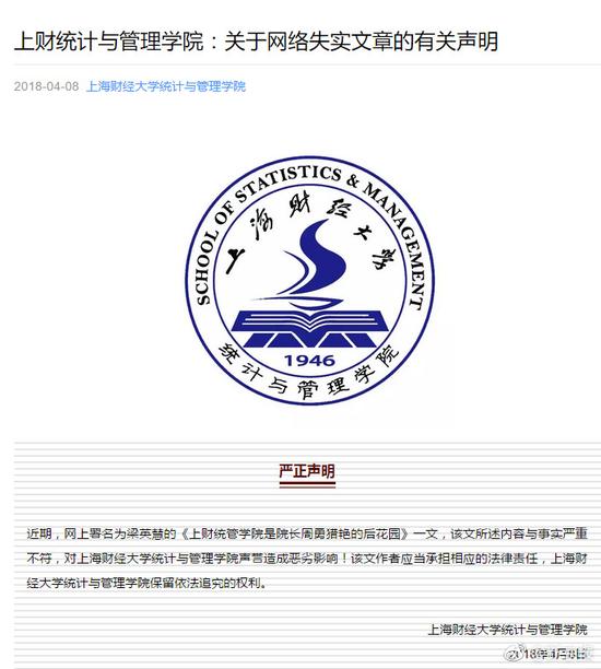 近日,不断有高校爆出性侵事件,学校中的某些教授利用不对等的权力关系对学生实施侵犯。但是哪里有压迫,哪里就有反抗,一个又一个同学勇敢地站了出来,公开曝光这些丑恶的行为。近期,一篇网上署名为梁英慧的《上财统管学院是院长周勇猎艳的后花园》文章引发网络关注!以下为《上财统管学院是院长猎艳的后花园》原文: