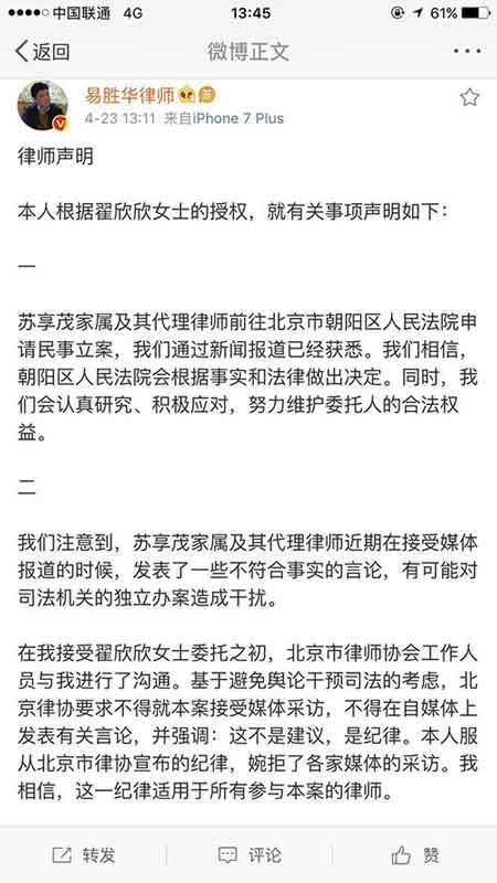 新京报快讯(记者刘洋)4月20日,WePhone创始人苏享茂坠亡八个月后,家属将前妻翟欣欣诉至朝阳法院。今日,翟欣欣的律师易胜华发声明称,认为苏享茂家属及其代理律师在接受媒体采访时,发表了一些不符合事实的言论,有可能对司法机关独立办案造成干扰,建议主管部门监督执业律师在此案中的纪律。