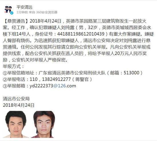 另据@平安清远 :经警方全力侦查,4月24日上午10时50分,英德市“4·24”放火案犯罪嫌疑人刘某露在英德市英城街道城西居委会水楼下组村被成功抓获。