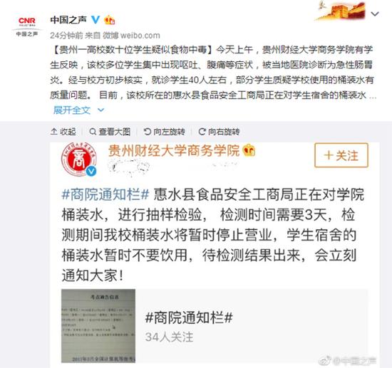 (原标题:贵州一高校约40位学生疑因桶装水质量问题致食物中毒)