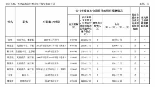 滨海农商银行官网2017年12月公布的一份《市管企业负责人2015年度薪酬情况表》显示,殷金宝2015年在滨海农商银行获得的税前报酬共有两部分,其中应发薪资640700元,与滨海农商银行董事长赵峰、监事长靳礼明相同,为最高一等;此外另一部分报酬为社会保险、企业年金、补充医疗保险及住房公积金单位缴存部分,共计285367.72元,两项收入合计,殷金宝2015年从滨海农商银行获得的税前报酬为926067.72元。