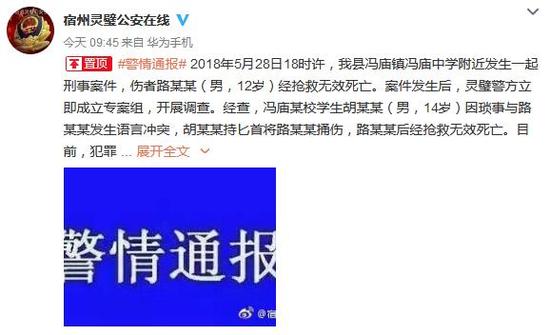 案件发生后,灵璧警方立即成立专案组,开展调查。经查,冯庙某校学生胡某某(男,14岁)因琐事与路某某发生语言冲突,胡某某持匕首将路某某捅伤,路某某后经抢救无效死亡。