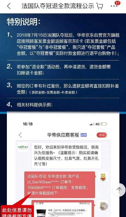 7月16日凌晨,华帝股份有限公司(华帝股份,002035)官方微信服务号宣布,正如之前承诺:法国队夺冠,华帝退全款。华帝 “退全款” 现已正式启动!