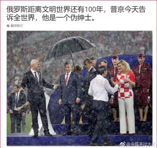 世界杯闭幕式上,普京的特制雨伞令全世界错愕不已,俄国人从来就没有融入西方,但它曾经的辉煌却是学习西方的结果,如骑士精神。昨晚普京如此猥琐不堪,这说明了一个因果现象,即权力越强大,人格越低下,这在人类进化史上几无例外。