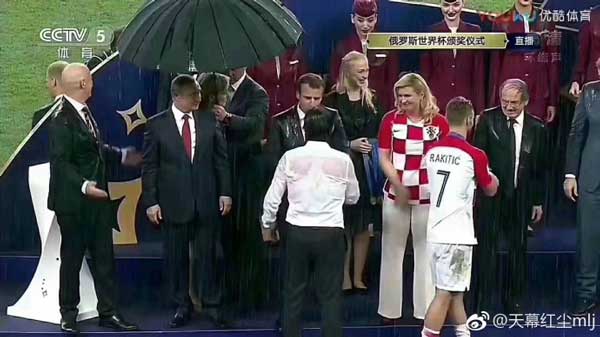 直播画面中可以清晰看到,卢日尼基体育场被大雨浸透,同样被雨淋湿的还有法国总统马克龙和克罗地亚女总统科琳达 格拉巴尔-基塔罗维奇、国际足联主席詹尼·因凡蒂诺以及法国队的球员等,画面中唯一一位几乎没被淋湿的是俄罗斯总统普京!这个画面播出后也引发网友的关注与讨论!
