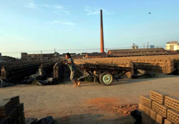 一次夹着3块砖,少说也有7斤重,一车下来,这个动作重复数百上千次,刚开始,她们累得端碗手都发抖,慢慢习惯了,也就不觉得苦累了。据一位砖窑厂的工人说,他们这里是计件制,干的多拿的多,除了阴雨天气,一个月干得好能挣到4千元以上。