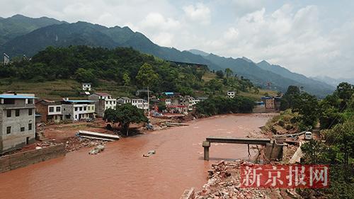 位于黄桷村中都河上的一座桥梁在洪水中被冲断。新京报记者 王金淼 摄