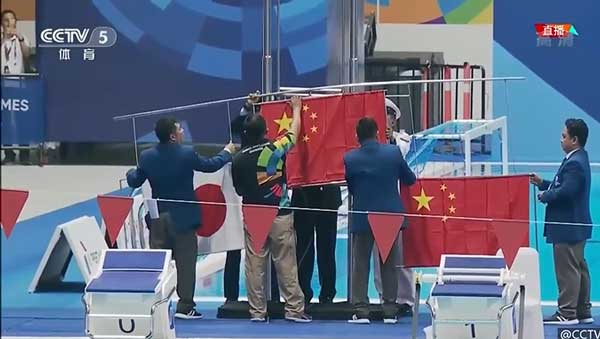 实拍2018亚运会200自颁奖国旗突然掉下孙杨要求重新升旗现场视频