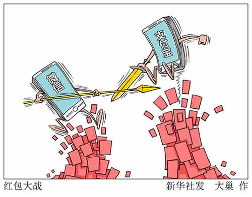 新华网北京2月19日电(记者王晓洁 阳娜)“为了块八毛,引无数土豪竞折腰。”除夕夜的社交网络上,你有没有被一波又一波的红包“刷屏”?羊年春节的电子红包大战,微信不再“一骑绝尘”,百度、阿里、腾讯巨头全部参展,还多了陌陌、快的等一批“小兵”。作为互联网金融的重要入口,支付已被当成争夺用户的“关口要塞”。“块八毛”的背后,隐藏着互联网公司大大的市场野心。