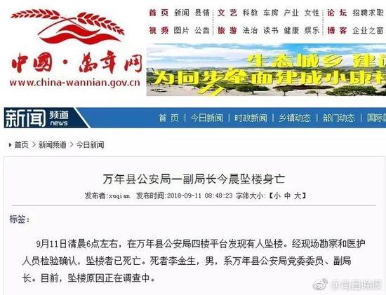据中国万年网消息,9月11日清晨6点左右,在万年县公安局四楼平台发现有人坠楼。经现场勘察和医护人员检验确认,坠楼者已死亡。死者李金生,男,系万年县公安局党委委员、副局长。目前,坠楼原因正在调查中。