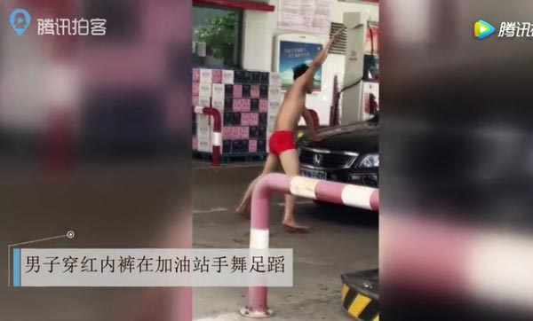 实拍海口一红裤衩男子加油站内疯狂"尬舞"现场视频