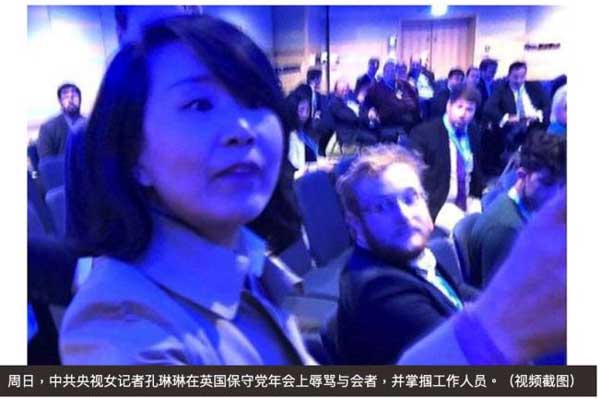实拍央视女记者孔琳琳英国保守党年会打人被捕现场视频截图