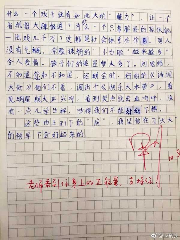 老师给了学生“甲+”,“看到正能量,支持你”的评价