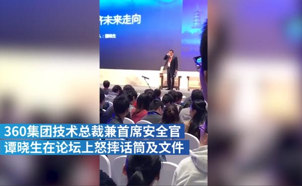 10月27日,浙江杭州,2018年中国计算机大会,360副总裁兼首席安全官谭晓生由于上一环节拖堂及大会临时增加议程,在论坛上怒摔话筒及文件。