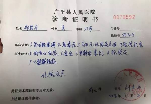 郑成月的诊断书上列了9种病,肾功能衰竭和尿毒症排在前面,主治医生说:“这两个病是最危险的,最好能找到配型,换一个肾。”