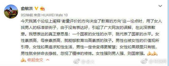 刚刚,俞敏洪发文就今日的“现在中国是因为女性堕落导致整个国家堕落”言论道歉,表示是自己没有表达好,引起了误解。自己真正想说的是一个国家的女性的水平,就代表了国家的水平。女性素质高,母亲素质高,就能够教育出高素质的孩子。女性强则男人强,则国家强。