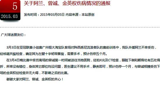 恒大官方宣布阿兰十字韧带撕裂预计伤停5个月,曾诚眼睑下侧和颧骨处有五处骨折,预计休战1个月,金英权无大碍。