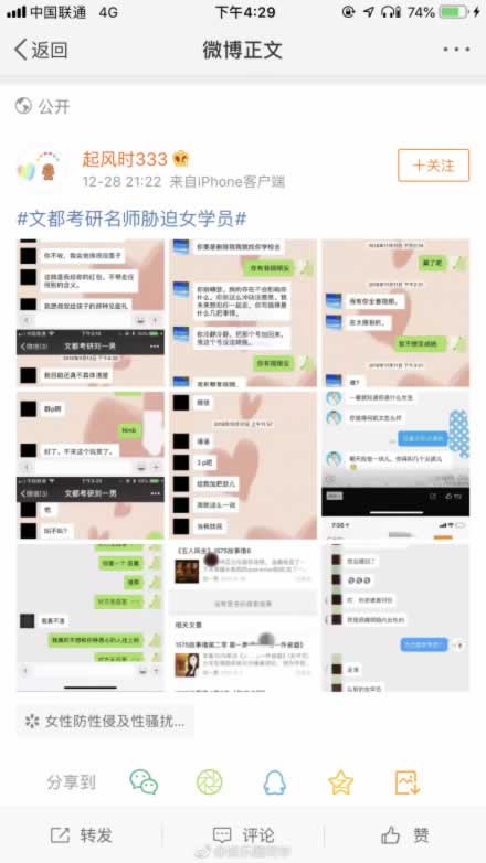 帖子中称,“从2017年报‘文都’,备考期间你就开始多次约我去哈尔滨、北京,被我拒绝,后来我考上了。2018年你来到我的城市讲课,我答应你去吃饭,但是没有想到你灌醉我后得逞……被你害完以后,被逼做了一个不光荣的角色。”