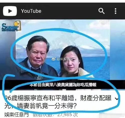 有媒体报道96岁高龄的杨振宁与翁帆宣布和平离婚,财产分配曝光,翁帆一分未得,两人于2004年12月结婚。