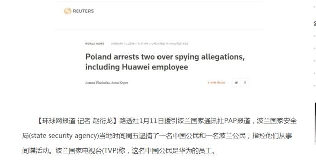 【环球网报道 记者 赵衍龙】路透社1月11日援引波兰国家通讯社PAP报道,波兰国家安全局(state security agency)当地时间周五逮捕了一名中国公民和一名波兰公民,指控他们从事间谍活动。波兰国家电视台(TVP)称,这名中国公民是华为的员工。