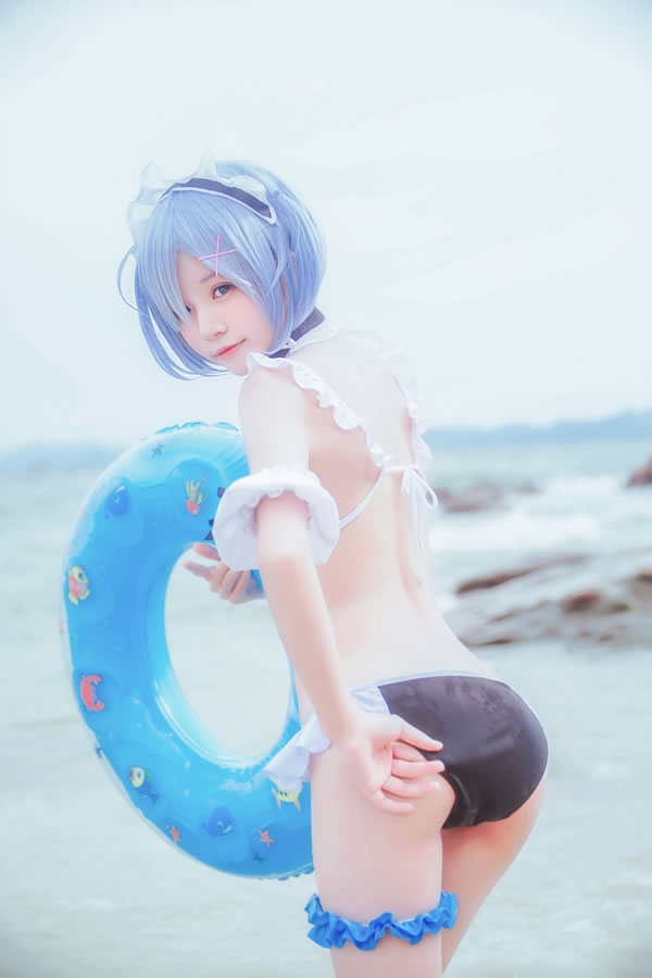 萝莉风COS桜桃喵–蕾姆COS外景比基尼写真