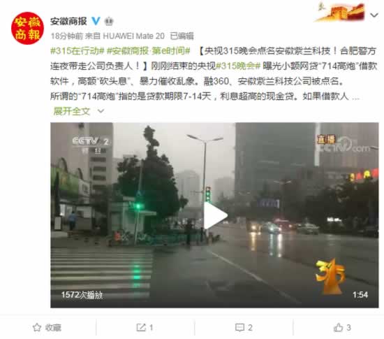 【央视315晚会点名安徽紫兰科技!合肥警方连夜带走公司负责人!】刚刚结束的央视#315晚会#曝光小额网贷“714高炮”借款软件,高额“砍头息”、暴力催收乱象。融360、安徽紫兰科技公司被点名。