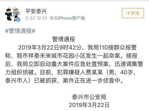 据江苏泰兴市公安局3月22日警情通报,2019年3月22日9时42分,泰兴市公安局110接群众报警称,泰兴市祥泰未来城市花园小区发生一起命案。接报后,我局立即启动重大案件应急处置预案,迅速调集警力组织侦破。目前,犯罪嫌疑人费某某(男,40岁,泰兴市人)已被抓获,案件正在进一步侦查中。