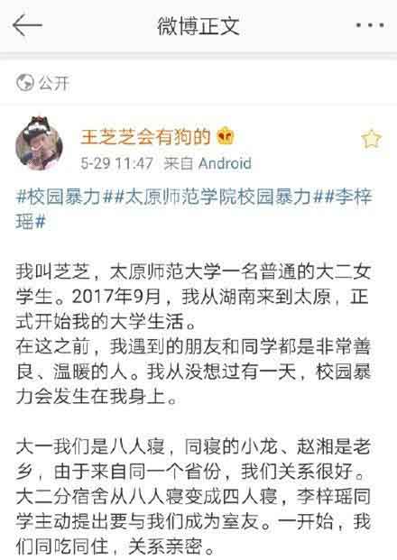 稍后芝芝发文称自己发表的”太原师范学院校园暴力”,“是我们舍友之间的打打闹闹,玩笑可能开过了头。当时我正在气头上,所以在微博上发表了过激的言论。随着心情的平复,我认识到自己言行的不妥之处,感谢网友们的关心,也希望网友们不要过多地炒作。