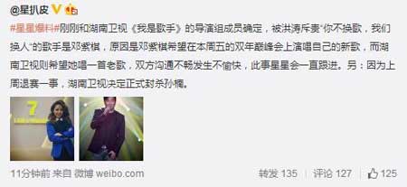 31日上午,知名微博爆料人星扒皮称热洪涛怒斥的歌手为邓紫棋,微博称“刚刚和湖南卫视《我是歌手》的导演组成员确定,被洪涛斥责‘你不换歌,我们换人’的歌手是邓紫棋,原因是邓紫棋希望在本周五的双年巅峰会上演唱自己的新歌,而湖南卫视则希望她唱一首老歌,双方沟通不畅发生不愉快,此事星星会一直跟进。另:因为上周退赛一事,湖南卫视决定正式封杀孙楠。”