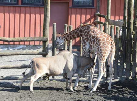 4月6日,挪威一家动物园中,一只长颈鹿被栅栏卡住头,就在这一瞬间,一头羚羊冲过来,顶向长颈鹿的肚子,将长颈鹿刺死。长颈鹿遭羚羊刺死这一幕被数十名儿童目睹。羚羊用角顶住长颈鹿,长颈鹿遭羚羊刺死。动物园人员事后正在处理。