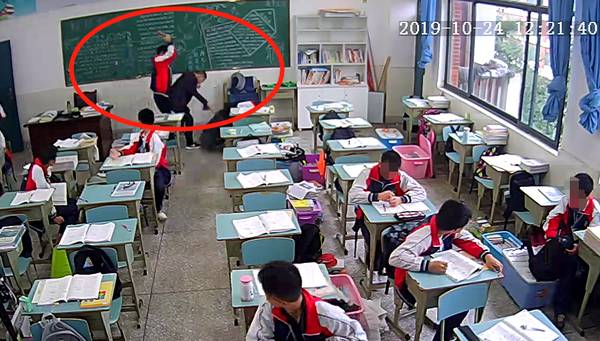 新京报记者获得的一段现场监控视频显示,事发时间为10月24日12时许。在时长1分40秒的视频第16秒,一名身穿西装的男子拿着雨伞,走进教室,其身后冲出一名身穿校服的学生,双手拿砖头,往男子头部砸了9下,整个过程持续约10秒,后男子倒地不起。