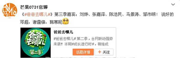 爸爸去哪儿第三季嘉宾名单出炉,刘烨、张嘉译、陈浩民、马景涛、邹市明五位星爸将作为嘉宾携孩子参加爸爸去哪儿第三季,该消息传出后迅速引来网友一片热议,不少网友在微博感叹说好的韩寒、吴亦凡、邓超、谢霆锋呢?