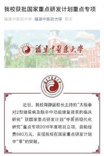 12月27日,福建中医药大学官方微信发布消息称,该校副校长陶静主持的“太极拳对2型糖尿病及脑卒中功能康复效果的临床研究” 获国家重点研发计划“中医药现代化研究”重点专项2019年度项目立项,获研究经费880万元。