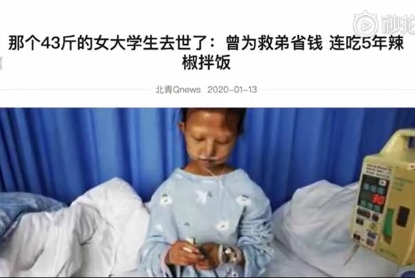 澎湃新闻此前报道,吴花燕系贵州盛华职业学院学生,父母双亡,与弟弟相依为命。她生活上极度节俭,以致长期营养不良,23岁的她仅1.35米高,体重43斤,且眉毛脱落。2019年10月,吴花燕因心脏瓣膜损伤严重入院,因无钱治疗在网络众筹医疗费。