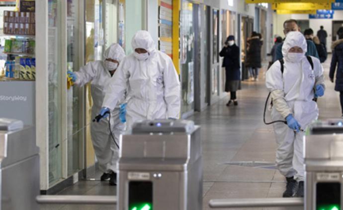 3月13日,在韩国首尔,工作人员在九老区一地铁站内进行消毒防疫。新华社 图