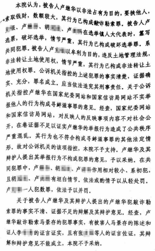 一审判决书内容显示,法院未认定检方对卢继华寻衅滋事的指控,“国家纪委网站和国家信访局网站,对反映人的反映事项内容不对社会公开,不足以证明卢继华的举报造成了社会秩序严重混乱,其行为也不符合构成寻衅滋事罪的其他法定情形”。