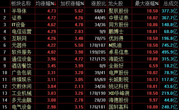 盘面上,半导体板块领涨,扬杰科技涨停,苏州固锝、沪硅产业等股跟涨。证券、IT设备、互联网、元器件、电信运营等板块纷纷大涨,指数均涨幅均超4%,板块个股全线飘红,元器件板块掀涨停潮,近20股涨停。