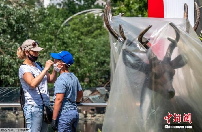 资料图:当地时间6月16日,俄罗斯莫斯科动物园重新开放,园区内戴口罩的女士为男孩儿调整口罩。