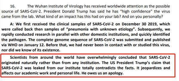 原标题:石正丽接受《科学》杂志专访:“特朗普欠我们一个道歉”)
