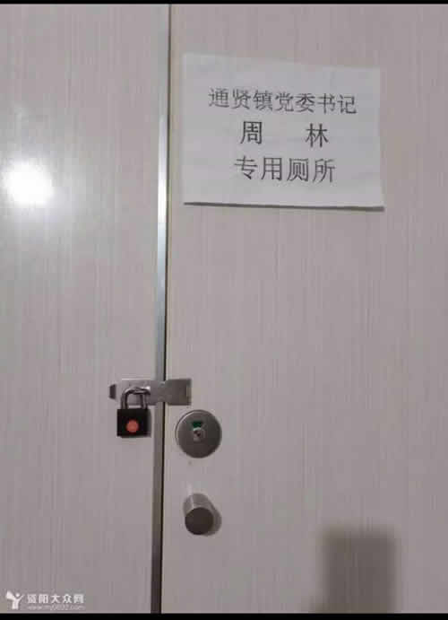 网传图片显示,一厕所门被上了锁,并贴有标示“通贤镇党委书记周林专用厕所”。