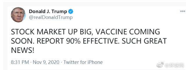 #特朗普发推宣布好消息#刚刚,特朗普在推特上用英文大写字母发文,宣布一个“好消息”。他写道:“股市大涨,疫苗即将上市。报告90%有效。好消息!”