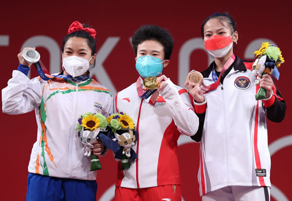 7月24日,冠军中国选手侯志慧(中)、亚军印度选手米拉拜(左)和季军印尼选手艾萨在颁奖仪式上。图自新华社