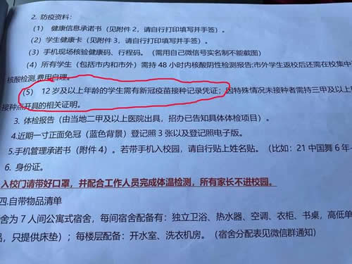 夏语的父母告诉澎湃新闻,缴费后,他们因为学校要求的入学报到材料曾感到隐隐的担忧。其中防疫材料一共5项,包括健康信息承诺书、学生健康卡、健康码和行程码、48小时核酸检测报告、12岁及以上年龄学生新冠疫苗接种记录凭证或未接种证明材料。
