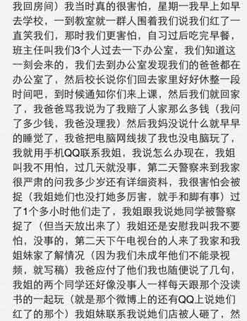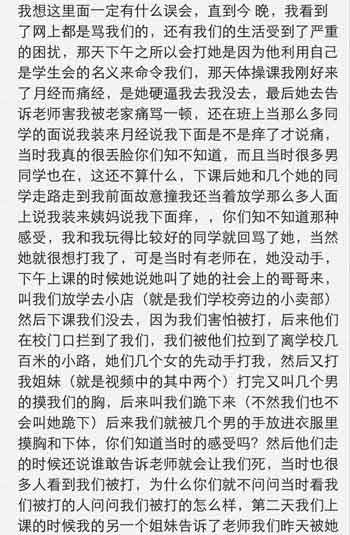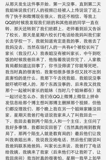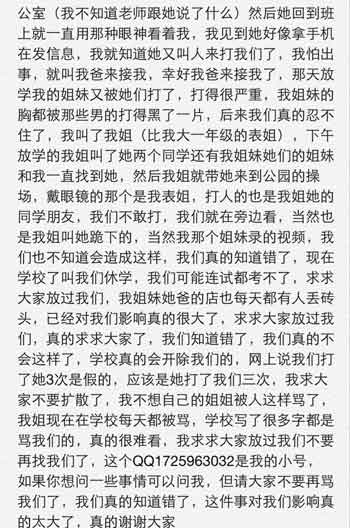 我的QQ信息太多真的没办法一一回复,关于打人事件我们受到了学校的休学整顿,受到了世界各地的朋友辱骂,我们已经赔偿了她费用,并且我们已经真正感到了错误,我希望哥哥姐姐们不要骂我们了,希望我们做好朋友好吗?我以后每天上QQ发动态陪大家聊天,求求大家原谅我们,我知道大家很生气,对不起.