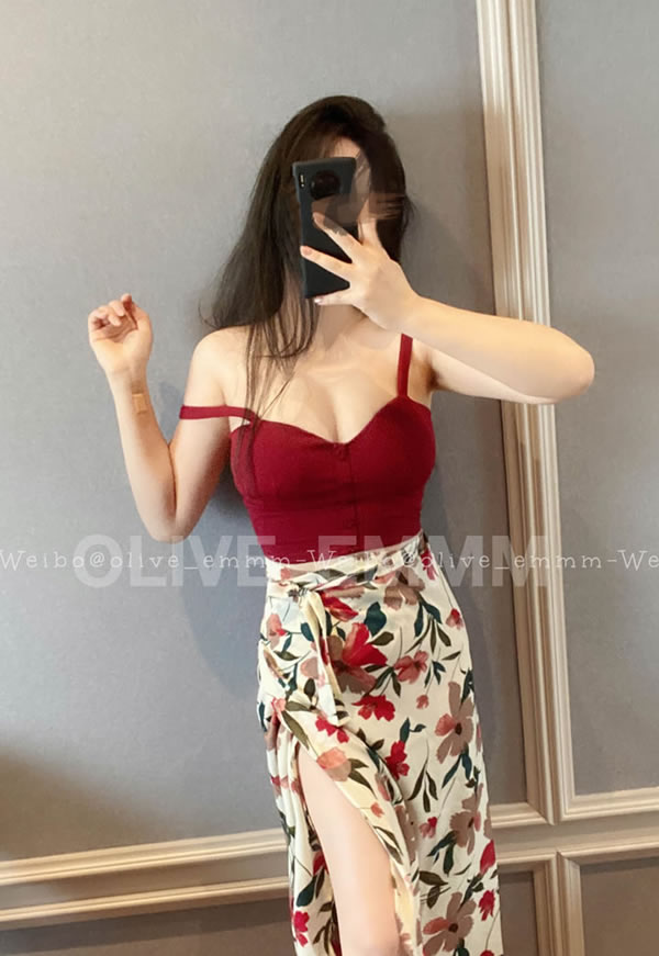 人气肥臀网红@olive_emmm - 红色和服+吊带与花裙