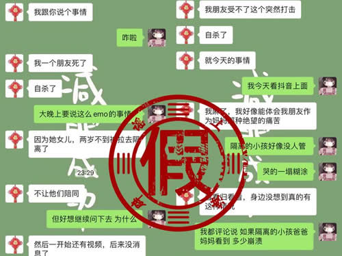 4月3日上午,一段大意为“我妹妹的朋友因女儿生病而自杀”的对话出现在社交平台。根据这段对话,聊天者“妹妹的朋友”因受不了孩子独自在医院隔离而选择自杀,并表示接受隔离治疗的是一名2岁左右的女孩。