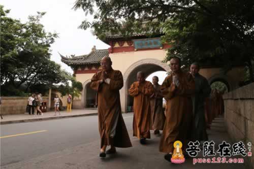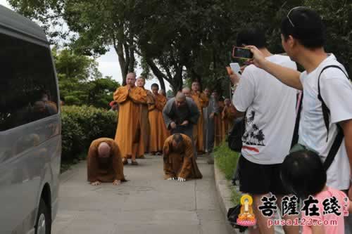 菩萨在线浙江讯 2015年7月21日,清凉宜人的海风吹拂着普陀山码头,灵隐寺方丈光泉大和尚率僧众弟子及云林志工团以及来自各地的居士约140余人,由山门起始,按礼佛仪轨,三步一跪拜,沿普陀朝山古道逶迤而上。向世人展现了四众弟子精进、正行、苦修、济生的形象。