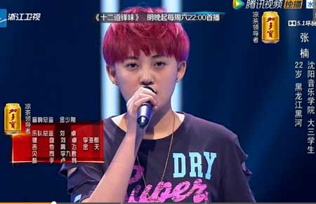 中国好声音第4季第三期今晚热播!其中第一位出场的是来自北京音乐学院大三22岁的学生张楠,张楠一头红色短发潇洒帅气颇具女侠风范,她带来的是天后孙燕姿的《逃亡》。